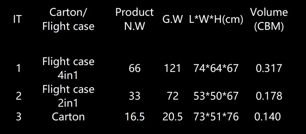 | IT | Product | Item | Quantity | Carton/ Flight case | CTN | Product N.W | G.W. | L*W*H (cm) | Volume (CBM) | ||